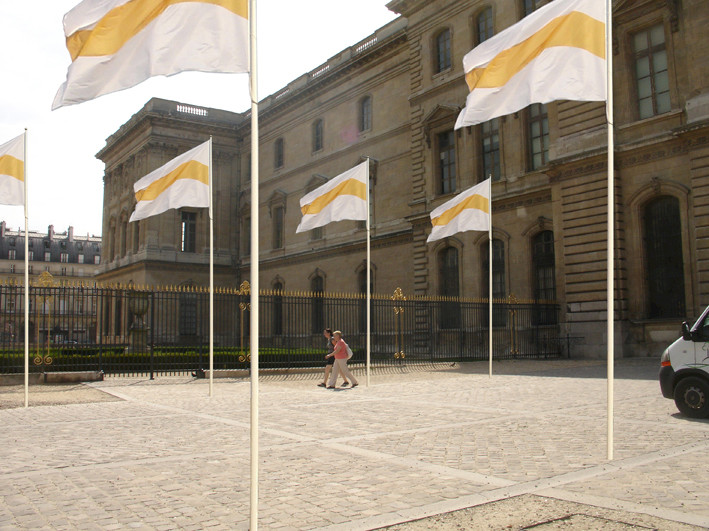 From October 22 until 25, during the FIAC art fair in Paris, in collaboration with the Musee du Louvre, FIAC presents a program of art projects in the Public Domain of Musee du Louvre and the Tuileries Gardens. The Flag of Compassion has been selected as one of the projects. Eight flagpoles, each measuring 8 meters high, with flags, size 200 x 280 cm, have been placed at Rue de Rivoli at the entrance Cour Carree of Musee du Louvre, which is also the entrance of FIAC.
