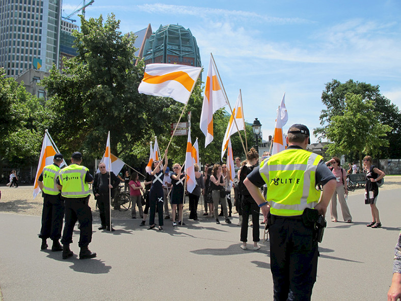 On Monday 27 of June, a group of teachers and art students gathered at the Royal Academy in The Hague. Carrying the “flags of compassion” we joined the demonstration “Mars der Beschaving”, an action organized to express disagreement with the disproportionate plans of the Dutch cabinet to cut down the budgets for the arts and culture (one of the many cuts this government has introduced).