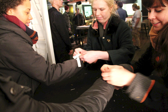 The handing out of the wristbands at the entrance was an important part of the work. The act of knotting required that we interacted with the audience of the Van Abbemuseum. We made eye contact with them, we chitchatted and touched their hands in a slightly intimate way. The act of knotting often consisted of three phases: we asked for their hands, we turned their hand so that the back of their hands was on the table and we tied the knot by making a small bow. All the visitors of the Van Abbemuseum had an entrance stamp on their wrists, so while tying the wristbands around people's wrists, we received traces of the stamps on our hands. This small, intimate exchange was an integral part of our interaction with the visitors.