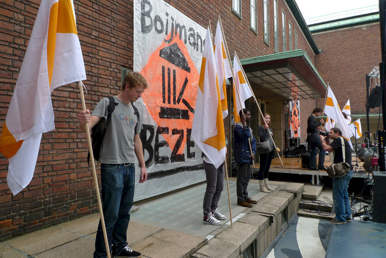 During the protest action Boijmans Bezet, a group of (ex) students from within higher art education employed the Flag of Compassion to focus attention on the lack of future prospects of art students as a result of the planned budget cuts in the cultural sector. Armed with the Flag, walking in a zigzag movement we were the first to occupy the square of the Boijmans Museum. During the various speeches the flag carriers were lined up next to the speakers. Speakers that with convincing arguments appealed the planned budget cut in the cultural sector.