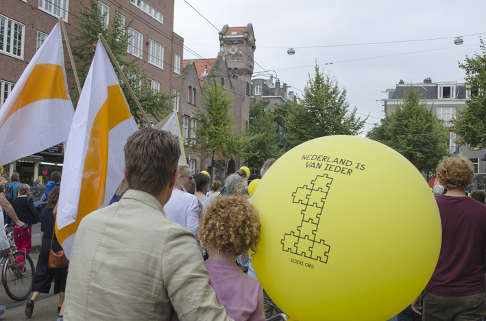 At the Amsterdam Bijlmer Arena, we joined a lively group of people from the Nieuw Dakota, a platform for contemporary art on the IJ in Amsterdam North. It was the day of the Ieder1 parade and our purpose was to carry several samples of the Flag of Compassion along the way, walking an 8 km distance until reaching our final destination at Museumplein.
