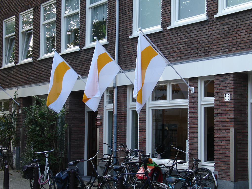 April 18-October 20: On the facade of the office building of Manifesta, Herengracht, Amsterdam, the Flag of Compassion is flying during the exhibition Dialoques.