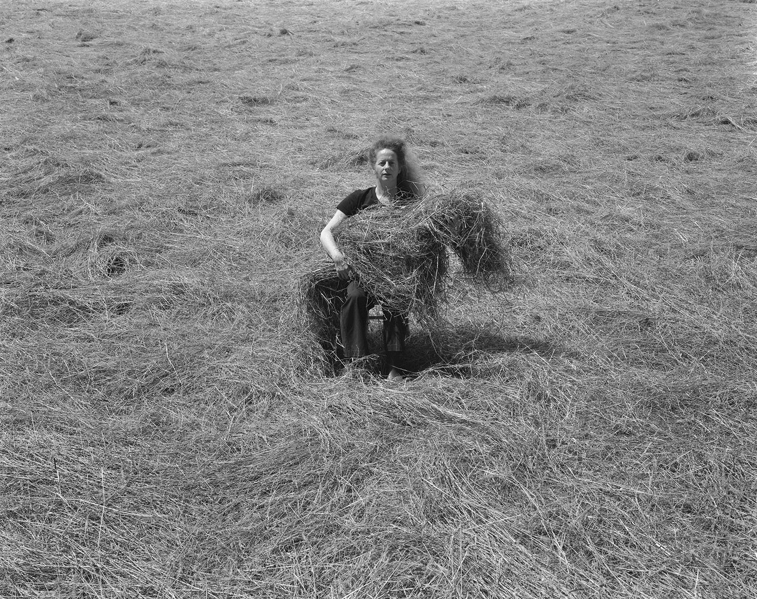 This self-portrait is taken in the middle of a big sloping meadow. The grass has just been mowed and a bundle of grass in the rough shape of a human figure is carried on the lap. The cut, dead grass is the new harvest and serves as food for animals. The photograph is part of the Pietà as well as the Homeland series.