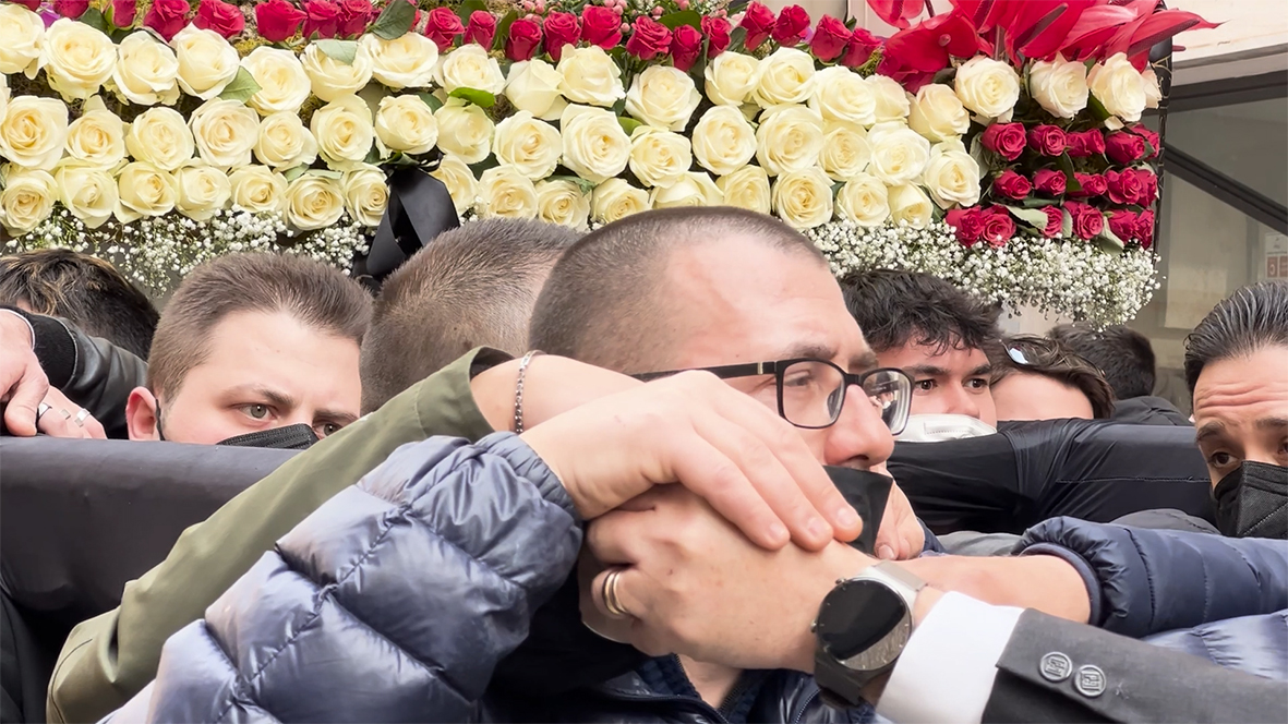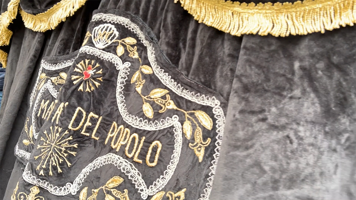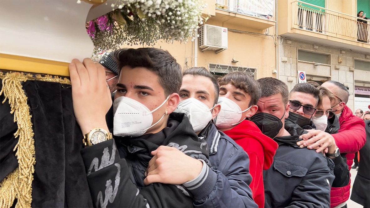 The video ends with a shot of a woman leading the stretcher and one can hear the choir of Trapani singing a song about Mary.