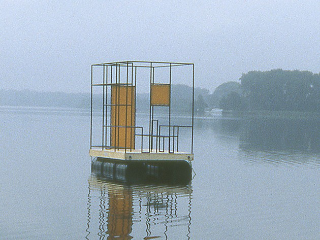 The raft sculpture Floating Asylum carries a metal framework of a small room. A bed, a table, a chair, a wardrobe, and a sink are delineated in the open structure. Only the door and the window, which usually make the connection between the inner and outer space, are covered with orange-yellow canvas. The open structure makes the borders between public and private space transparent whilst the covering of the door and window opening gives a sense of safety and security. As such, the work is about physical and mental protection as well as the friction between isolation and connection.