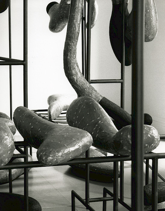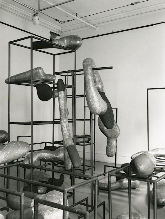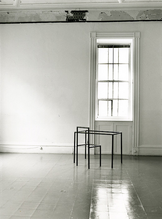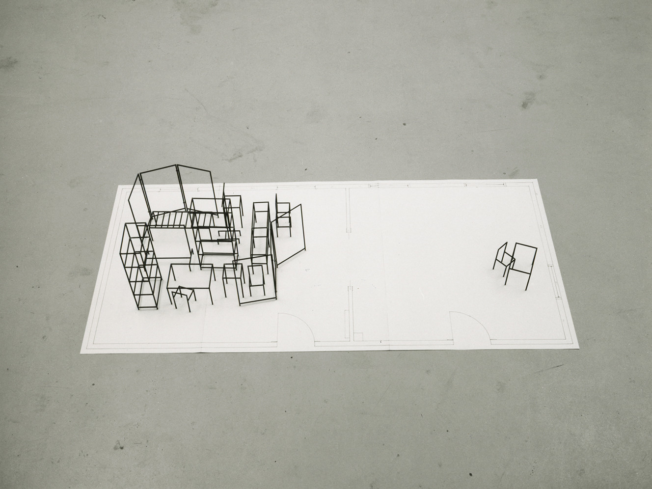 The work consisted of two rooms separated by sliding doors. The front room was totally empty with the exception of two metal constructions placed near the window. One construction had the contours of a table, the other of a chair. The back room, behind the sliding doors, was completely filled with metal constructions placed in such a way that one could only walk around them along the wall. In, on and under these constructions were 24 different shapes, a kind of alphabet.