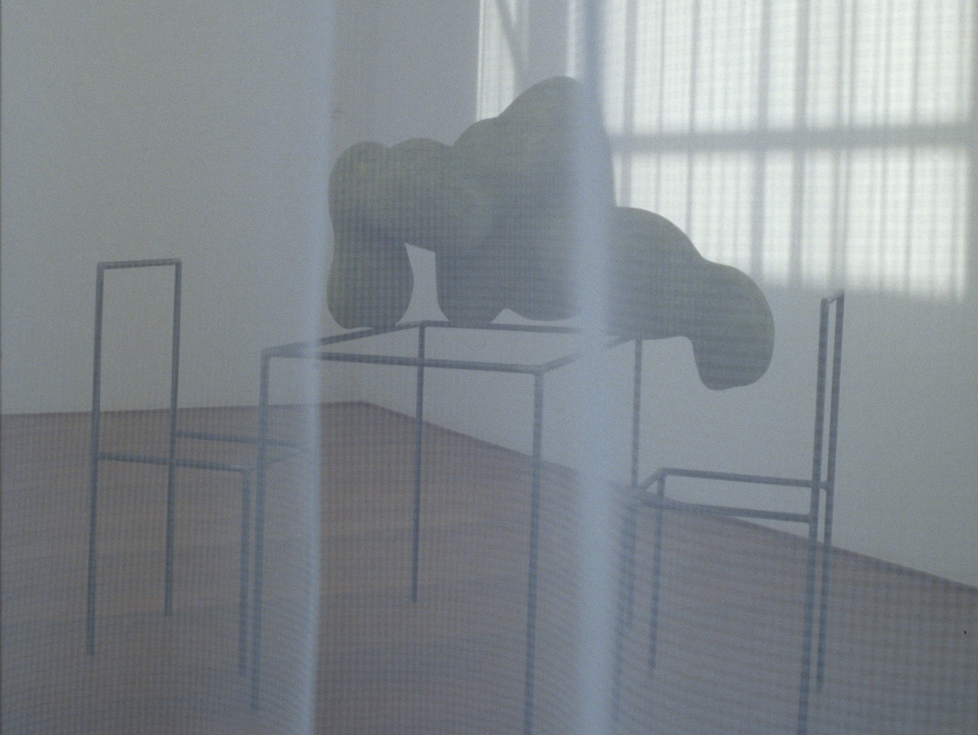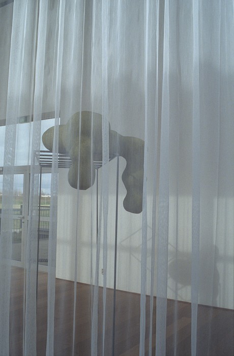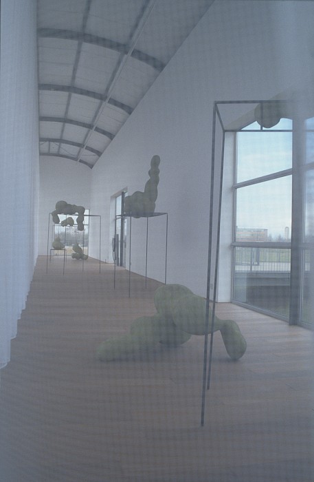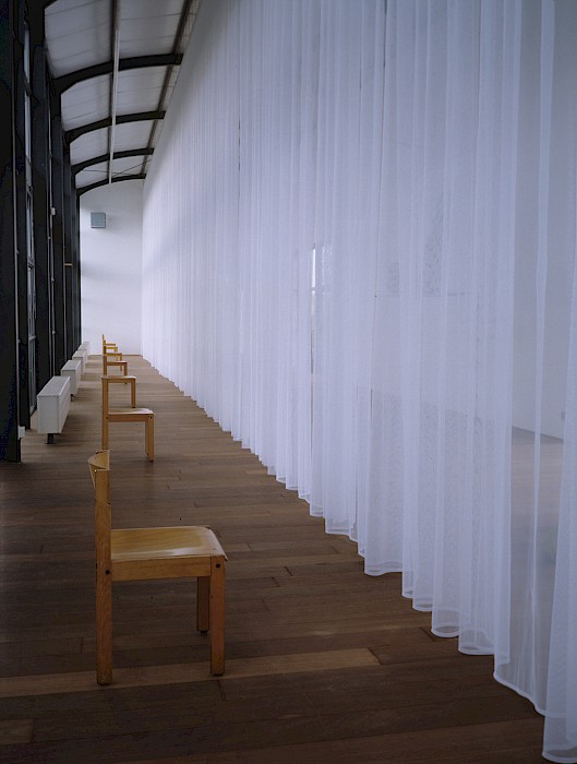 The Pavilions (Paviljoens) in Almere is composed of several connected, long building parts on pillars, situated in a deserted and uncultivated terrain. The building sections look like waiting rooms or train wagons stationed on a sideline. The architectural setting of the inner space, on the one hand, is an open structure, a steel frame, that makes the connection with the outside totally transparent, while on the other hand, the inside walls give the space a feeling of safety and security. This open and at the same time closed structure was an important factor in making the work. About which the artist once wrote: 'The structure is there to make evident the presence of the immaterial.'