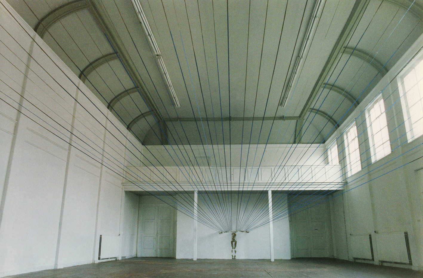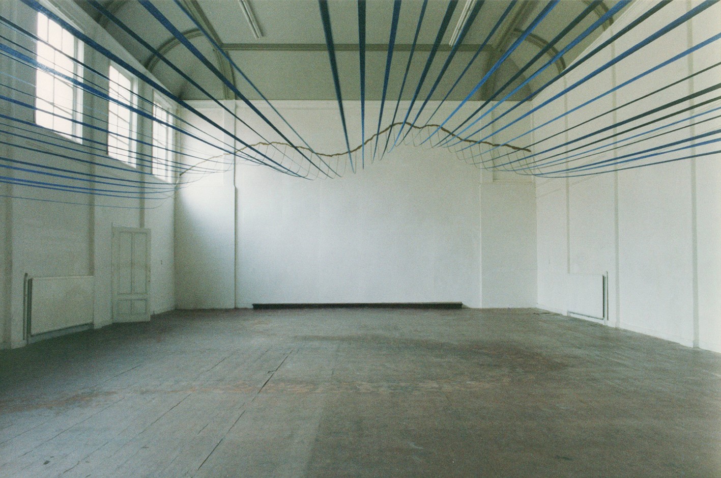 In the twenty-three meters long hall of the Ennu Foundation building, a clay imprint of a human body is visible, without the head. The arms are spread out, and from this horizontal line, many blue ribbons are stretched to the other side of the room, where they spread high across the wall in an undulating line. This line has been drawn in clay on the wall and suggests a figure lying down as well as a mountainous landscape.