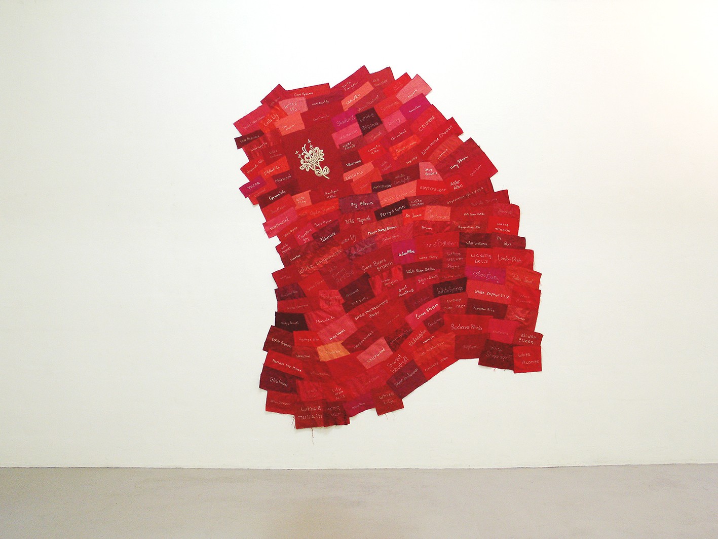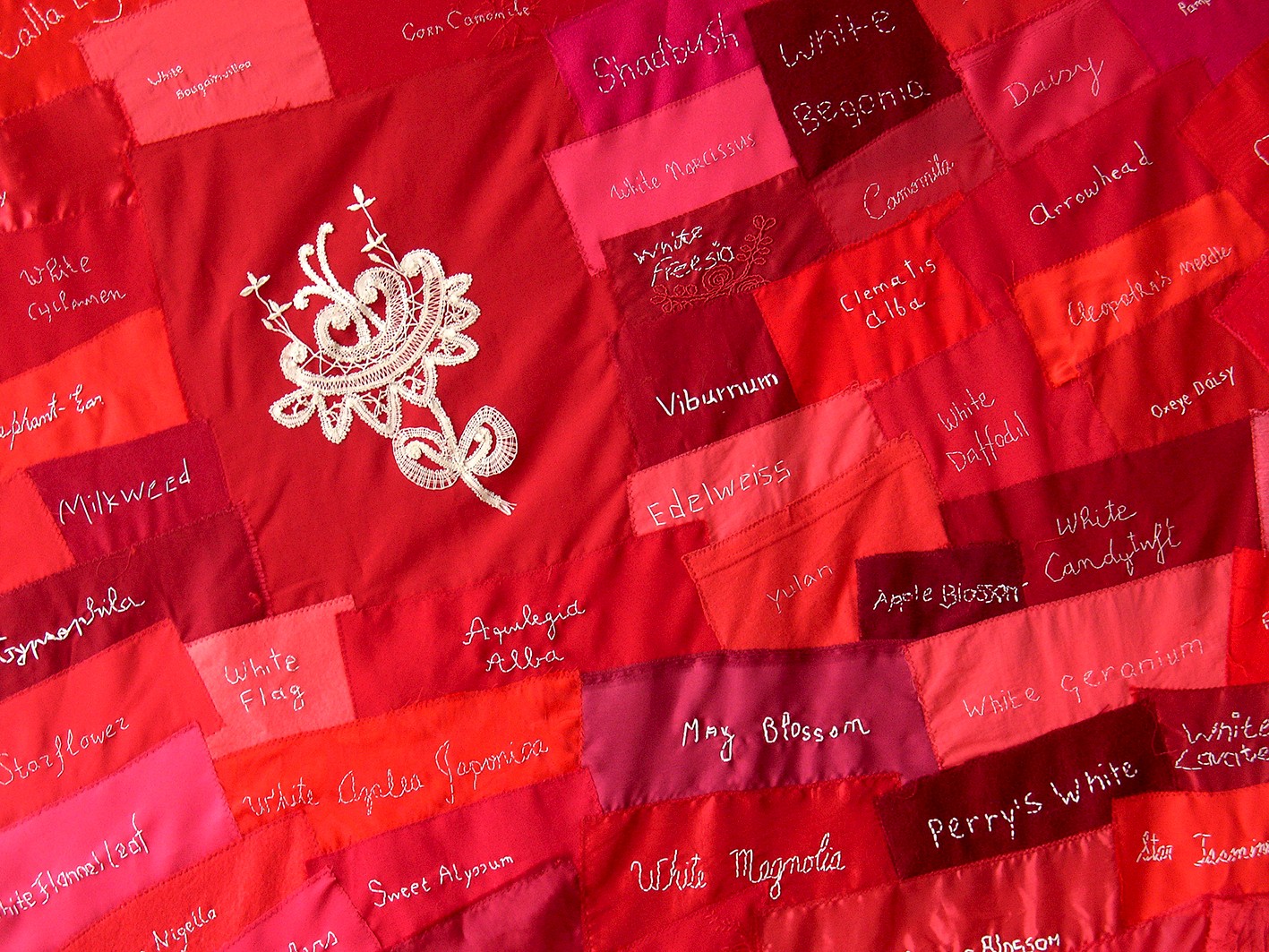 Around a white handmade bobbin lace flower, the names of white flowers are embroidered on a patchwork of various pieces of red fabric.
