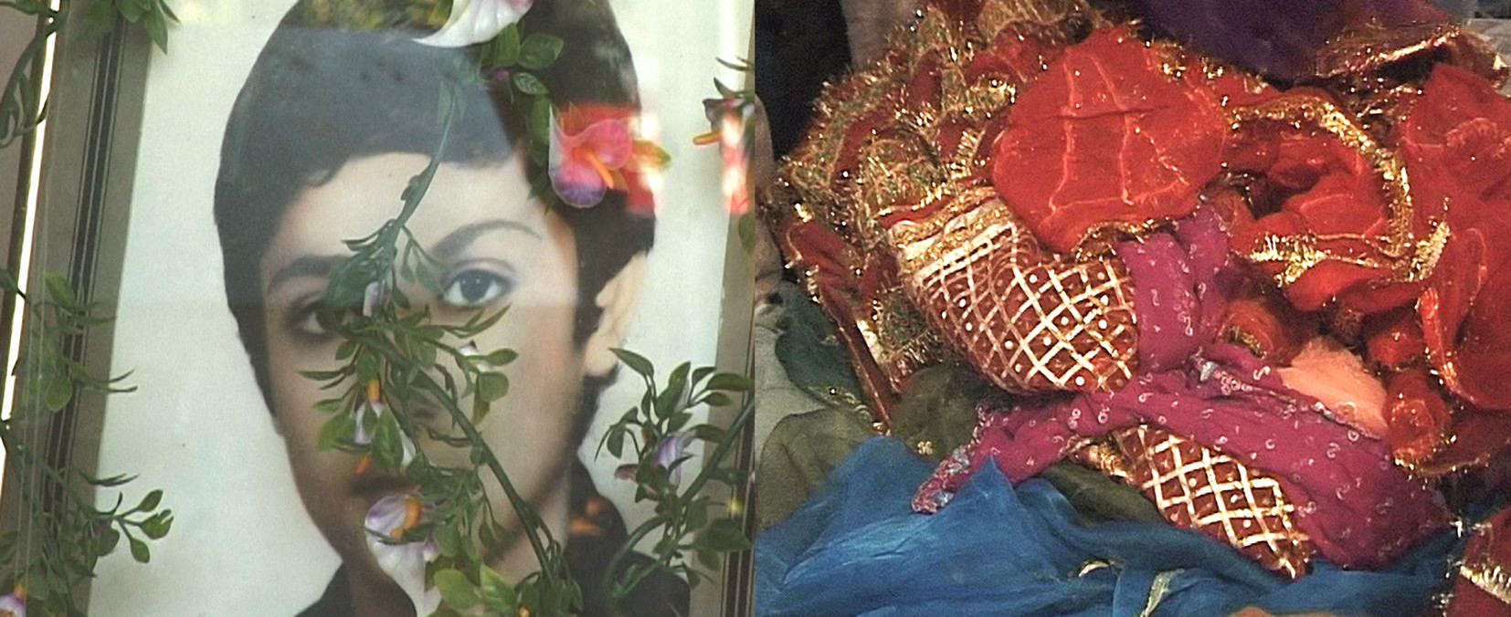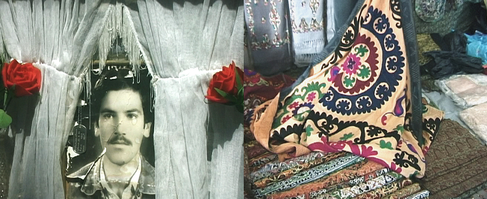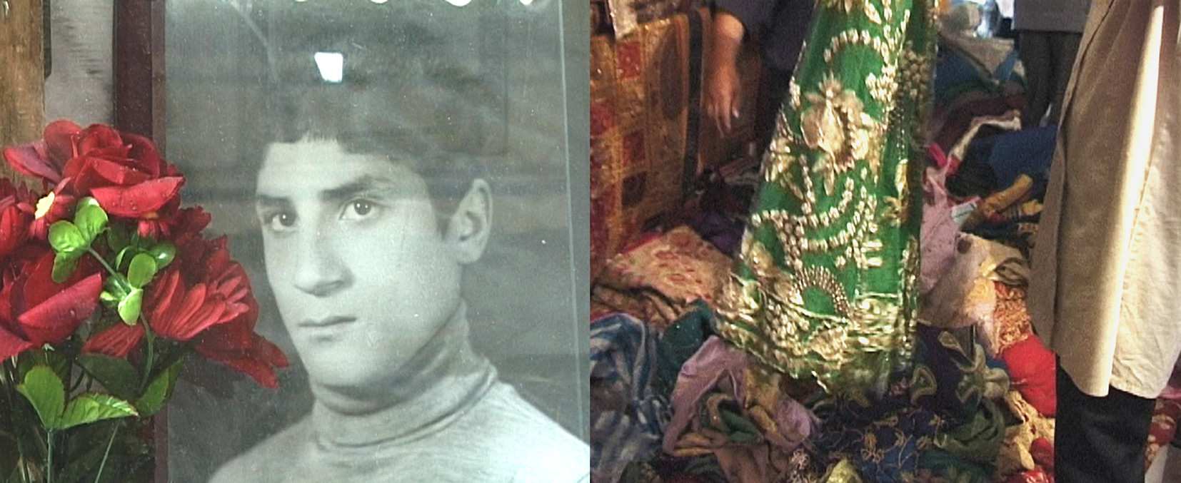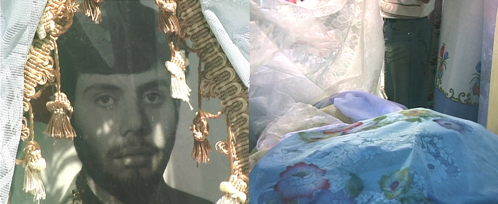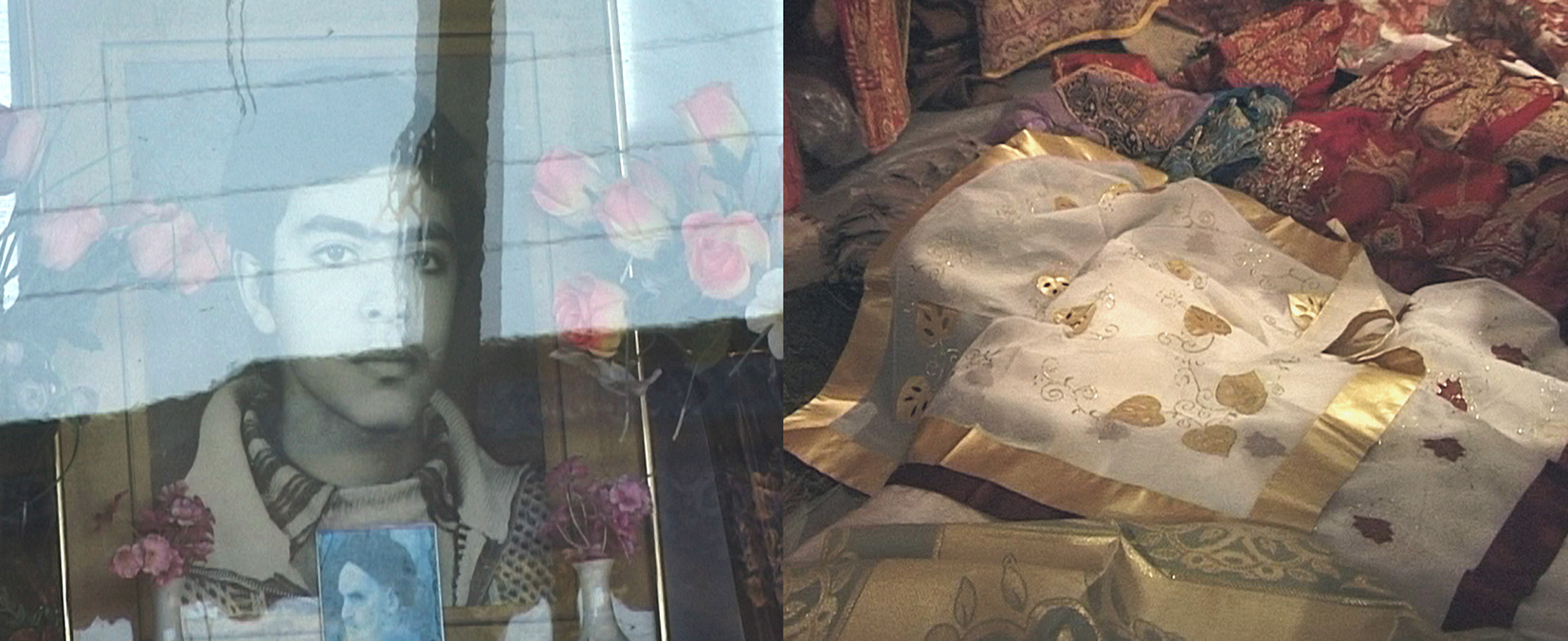 The series of diptyches photographs entitled Blossom are stills from the film Blossom. On one side, one sees images of dead Iranian young men (martyrs from the 1980-1988 Iraq-Iran war) –shown in a small glass case, a symbolic bridal room. In these memorial cases, relatives have placed memorabilia and flowers as well as transparent curtains.