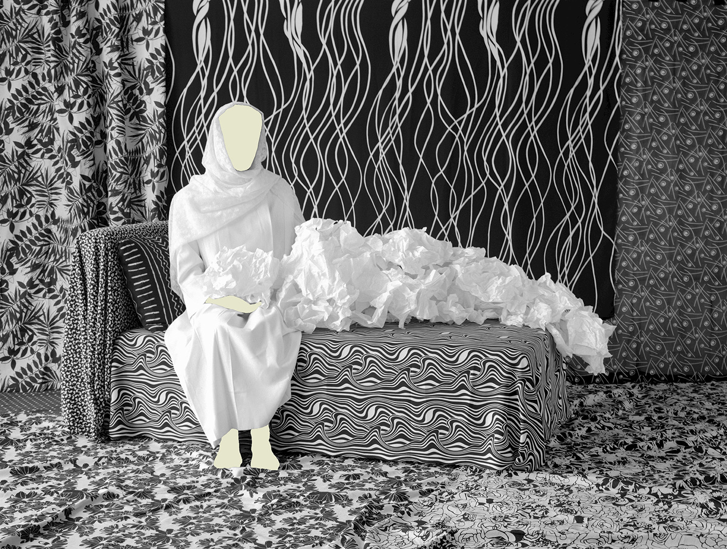 The woman holds a heap of blank paper on her lap and is surrounded by various black and white fabrics of different origins. The work refers to the form and meaning of the Pietà, a religious image of the Virgin Mary holding the lifeless body of Christ on her lap. Yet, the work does not represent Mary but is left open for interpretation since the skin of the woman's head, hands, and feet is transparent.