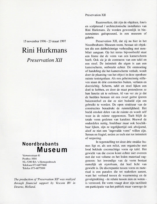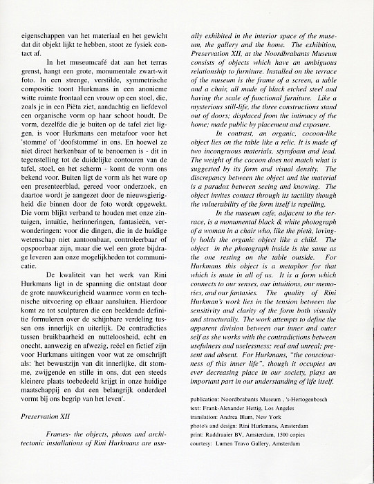 Hettig, Frank Alexander. Rini Hurkmans. Preservation XII. 's-Hertogenbosch: Noordbrabants Museum, November 1996.